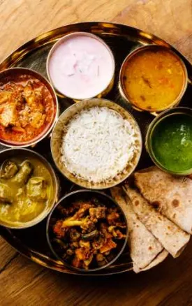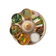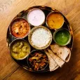 Order NowSteamed rice served with mixed vegetable curry, bok choy, lentil soup, chicken, homemade curd, Nepali- style tomato pickle, fresh green salad, and crispy papadum
